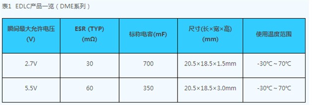 表1為村田制作所的EDLC產(chǎn)品一覽,圖4為使用了村田EDLC的LEDflach演示板。這個(gè)系統(tǒng)能在33毫秒內(nèi)向LED提供最大為8A的大電流。(可控制在2A-8A/10-60毫秒)