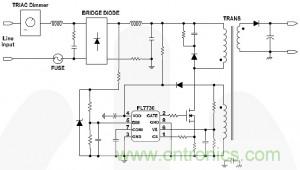 這一架構(gòu)現(xiàn)在已經(jīng)用于兩款新的PWM控制器,即可調(diào)光 FL7730 PWM 控制器和非調(diào)光 FL7732 PWM 控制器。圖2是簡化的應(yīng)用原理圖,顯示用于TRIAC調(diào)光的FL7730器件。
