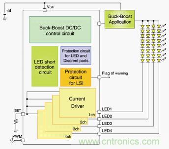 作為背光燈的驅(qū)動,首先是由DC/DC轉(zhuǎn)換器,生成一定的電壓。將DC/DC轉(zhuǎn)換器的輸出連接到面板的LED陽極側(cè),由LED的陰極側(cè)向LED驅(qū)動器灌入恒定電流,使LED發(fā)光。為支持小功率的多燈LED驅(qū)動,LED的通道數(shù)(可連接的列數(shù))設(shè)計(jì)為4。