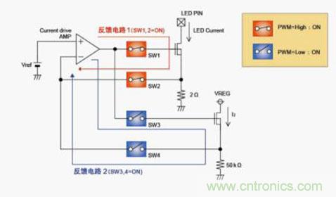 這兩條反饋通路由各SW進(jìn)行切換。在PWM=High(LED為ON)區(qū)間,驅(qū)動LED電流輸出用的反饋電路(圖3反饋電路1),由LED引腳灌入LED電流。在PWM=Low(LED為OFF)區(qū)間,驅(qū)動另一條反饋電路(圖3反饋電路2),由內(nèi)部恒定電壓VREG產(chǎn)生電流。通過進(jìn)行這樣的控制,LED電流雖然是關(guān)斷的,但電流驅(qū)動放大器始終處于驅(qū)動狀態(tài),PWM=Low→High時可平穩(wěn)生成LED電流。由于反饋通路2的電流I2已設(shè)定為數(shù)μA,因此,本電路結(jié)構(gòu)的功耗增加量已達(dá)到可以忽視的水平。