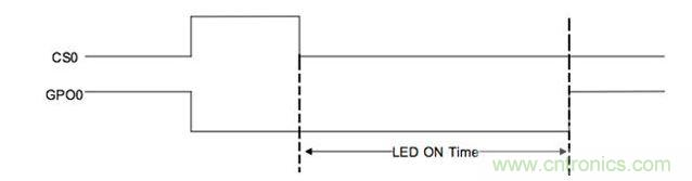 通常對于電容式按鍵來說,LED直接位于按鍵之下,從中心位置發(fā)光。用戶手指放在按鍵上,LED就會被隱藏起來。在此情況下,如果用戶手剛從按鍵上拿開LED燈就馬上關(guān)閉,那么用戶可能難以確定按鍵操作到底成功沒有。為此,我們可以讓LED在觸摸結(jié)束后保持“開啟”一小段時間,從而為用戶提供更好的視覺反饋。這種特性就叫LED開啟時間,如圖2所示。