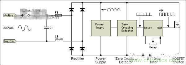 同樣,如圖所示,L1、C1起RF抑制作用。電路中有過零檢測和計時器,過零檢測到過零時重置計時器,且使計時器輸出高電壓,開啟MOSFET,電路導(dǎo)通,計時器開始計時,經(jīng)過設(shè)定時間(ms,小于半周期)后,計時器輸出低電平,MOSFET關(guān)閉。電壓輸出中斷。
