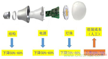 從上圖表示,LED光源產(chǎn)品無(wú)論是從結(jié)構(gòu),電源還是燈珠,成本都有大幅下降至少50%,然而人工組裝成本卻漲幅近20%-30%。晶豐明源銷(xiāo)售總監(jiān)李寧在第六屆華強(qiáng)國(guó)際LED照明市場(chǎng)戰(zhàn)略暨創(chuàng)新技術(shù)研討會(huì)上表示:“晶豐明源將持續(xù)提供更高性?xún)r(jià)比的整體電源方案來(lái)提高客戶(hù)的競(jìng)爭(zhēng)力,其次,實(shí)現(xiàn)全自動(dòng)化生產(chǎn),提高效率,從而幫助客戶(hù)降低人工成本。”