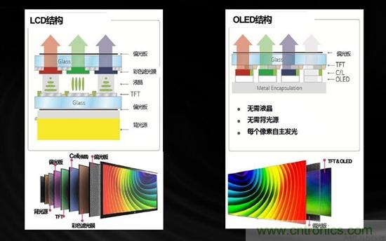 如果將OLED與傳統LCD結構進行對比,OLED最大的特點是無需液晶、無需背光源和每個像素都能自主發光,從圖中看OLED的結構的確更加簡單,而正是這樣的結構設計讓它有了超越傳統的優異表現。