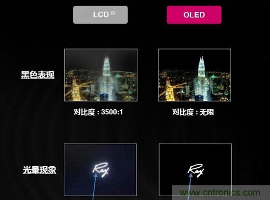 OLED電視由于顯示原理的不同,在畫質方面相較LCD液晶電視的優勢還體現在它的對比度上,因為OLED的所有像素都是自發光,所以理論上對比度是無限的,因而可以呈現完美的黑色顯示;而LCD電視無法完全遮擋背光源的光線,不可避免出現漏光和光暈現象,并且大部分傳統的LCD電視對比度不到5000:1,播放純黑畫面時則呈現為深灰色。