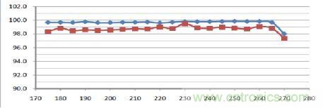 圖中的藍色為恒流源本身的效率,紅色為包括了整流器在內(nèi)的全部電源的效率。由圖中可見當(dāng)市電電壓從175V增加到265V時,它的效率一直保持在99%以上。這樣高效率的恒流源,放到鋁基板上以后就基本上不會增加鋁基板的熱量,也就不會降低光引擎的熱光效,更不會降低光引擎的壽命了!此外它的效率也不隨溫度而變化: