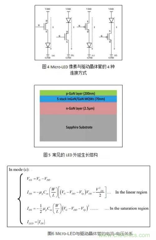 圖4(a)中Micro-LED像素連接在N型驅動晶體管的源極(Source)。由外延生長(Epitaxial Growth)、制備工藝、及器件老化所產生的不均勻性所導致的Micro-LED電學特性的不均勻性將會直接影響驅動晶體管的VGS,從而造成顯示圖像的不均勻。而圖4(c)中的Micro-LED像素連接在P型驅動晶體管的漏極(Drain),可以避免上述影響,其電流-電壓關系圖6所示。因此,有P管像素電路驅動Micro-LED較為適宜。