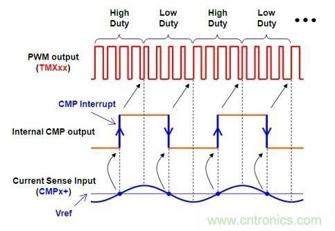 對于開關電源,PWM占空比決定輸出電壓,如圖3,電路開始工作后,LED電流經采樣后加到MCU內置比較器端口,和參考值進行比較,產生中斷信號,來調整PWM的占空比,其變化過程見圖4,如當電流大于參考值時,降低占空比;反之,提高占空比,最終達到一個負載電流動態穩定的狀態。