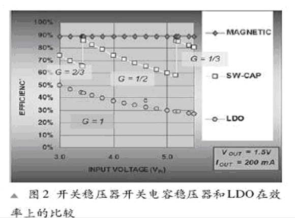 由于具有電壓增益的關(guān)系,一個(gè)開關(guān)電容穩(wěn)壓器是比線性穩(wěn)壓器更有效的解決方案,這個(gè)電壓增益是通過在雙相位(充電相位和傳輸相位)中的堆疊電容器和并行電容器所取得的輸入電壓與輸出電壓比率。例如:位于增益配置中的一個(gè)開關(guān)電容轉(zhuǎn)換器的1/2將把一個(gè)3.6V的輸入電壓(VIN)轉(zhuǎn)變?yōu)?.8V的輸出電壓(VOUT)。如果要求的電壓(VOUT)是1.5V,那么功耗僅為300mV與負(fù)載電流的乘積。這相當(dāng)于83%的效率。