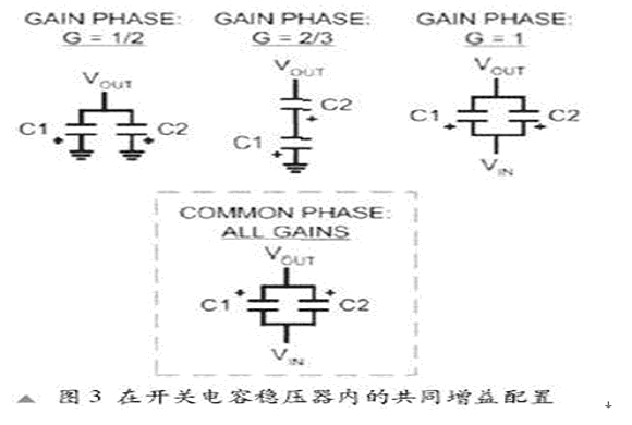 開關(guān)電容穩(wěn)壓器的更多增益可能會(huì)增加一點(diǎn)點(diǎn)效率,但是卻要增加更多外部電容器和內(nèi)部功率FET,從而增加成本,同時(shí)也加大了解決方案的尺寸。上述的增益可以通過兩個(gè)外部電容器或快速電容器(CFLY)來取得。這些電容器用于存儲(chǔ)電荷并將電荷從VIN 傳輸?shù)?VOUT。除了快速電容(CFLY) ,我們還需要一個(gè)輸入電容器(CIN),和一個(gè)輸出電容器(COUT),輸入電容器(CIN)指示出電壓紋波,而輸出電容器(COUT)控制輸出電壓紋波。根據(jù)VIN 和 VOUT 可接受的紋波取值,CIN 和COUT 的典型值范圍是從1mF 到10mF 。CFLY 的數(shù)量通常比COUT 少。外部電容器(CFLY)通過內(nèi)部的功率FET在不同的配置中連接到芯片。圖3顯示出2/3, 1/2和1增益的不同配置。電容器C1和C2是快速電容器或CFLY。CIN和COUT已被刪除以達(dá)到簡化目的。如圖所示,一個(gè)增益通過兩相位間的交替變化來取得,其中包括充電相位或普通相位和放電相位。在不同的增益之間具有一個(gè)共同相位以便在增益間達(dá)到完美躍遷。我們可以通過共同相位,根據(jù)需要隨時(shí)進(jìn)行增益躍遷。一個(gè)開關(guān)電容穩(wěn)壓器在芯片上可能有一個(gè)到2個(gè)功率FET。然而,一個(gè)開關(guān)電容穩(wěn)壓器可能在芯片上任何位置設(shè)有4個(gè)到9個(gè)或者更多的功率FET(根據(jù)離散電壓增益的數(shù)量)。這就限制了在既定的裸片尺寸下,開關(guān)電容穩(wěn)壓器的輸出電流性能。圖4在開關(guān)、開關(guān)電容器和線性穩(wěn)壓器間的負(fù)載性能、效率和尺寸上進(jìn)行了比較。