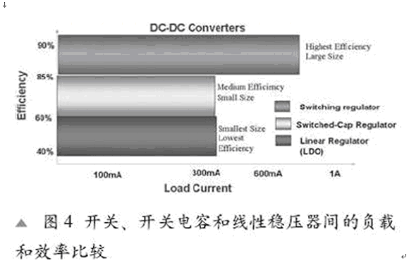 隨著VIN的增長,由轉(zhuǎn)換器產(chǎn)生的VIN和VOUT 間的增量增長引起功率消耗的增長和效率的下降。解決這個(gè)問題的一個(gè)方式是轉(zhuǎn)變成一個(gè)更高的效率增益,就像給汽車替換齒輪一樣。圖2顯示了一個(gè)開關(guān)電容器降壓穩(wěn)壓器,一個(gè)LDO及一個(gè)開關(guān)電容器的效率曲線。開關(guān)電容器具有一個(gè)模擬增益控制和增益變化以保持一個(gè)給定負(fù)載效率的持續(xù)性。開關(guān)電容器并具有離散增益步驟,由VOUT/(增益 *VIN)與離散增益來決定效率的高低。一個(gè)LDO僅有1的增益及三者中最低的效率。開關(guān)電容器(SC)穩(wěn)壓器則有三個(gè)不同的電壓增益(2/3,1/2和1/3)。我們可以看到,開關(guān)電容穩(wěn)壓器隨著VIN 的增長,電壓增益從2/3轉(zhuǎn)到1/2以及從1/2到1/3,因此整個(gè)負(fù)載范圍的效率達(dá)到最大化。這就帶來了在Li-ion 范圍上(3.4V到3.8V)80%的效率。在相同應(yīng)用中的一個(gè)LDO僅能達(dá)到50%的效率。根據(jù)電感器種類,一個(gè)典型的開關(guān)穩(wěn)壓器大約具有88-90%的效率。