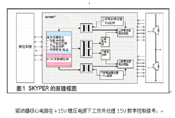圖1是SKYPER驅動電路的原理框圖。該電路是一個半橋電路,它具備基本驅動電路所有的功能,如電勢隔離,保護功能如VCE監測,短脈沖抑制,欠壓監測以及死區時間。通過使用ASIC芯片以及基于基本驅動器功能的驅動器設計,它需要的元器件比傳統的驅動電路要少得多。