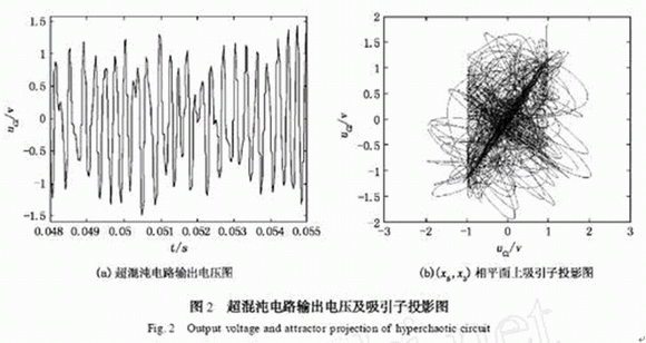 典型超混沌信號及相圖如圖2(a)、(b)所示,此時超混沌信號對應的李雅普諾夫指數為:λ1=0.042λ2=0.008,λ3=0.000,λ4=-0.067。用于計算機模擬中除圖中給出的超混沌信號外,對應的混沌和亞超混沌信號的李雅普諾夫指數分別為:λ1=0.029,λ2=0.000,λ3=-0.038,λ4=-0.097和λ1=0.033,λ2=0.000,λ3=0.000,λ4=-0.073。