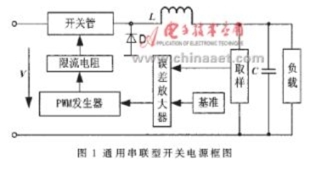 通用串聯型開關電源的框圖如圖1所示。輸出電壓取樣后經過誤差放大器放大后控制PWM發生器產生脈沖,脈沖經過限流電阻后驅動開關管工作。開關管導通時電感儲存能量的同時給濾波電容和負載同時供電,開關管斷開時電感上儲存的能量釋放使負載得到較穩定的連續電流,因此這種電源在小電感下可傳輸較大的功率,但由于其輸入電壓在寬范圍內變化,很難選擇合適的限流電阻。如果選擇小的限流電阻,低電壓下的驅動特性較好,但高電壓時由于電阻上的損耗過大、開關管過飽和使得開關特性變差;選擇大的限流電阻時,高電壓下驅動特性較好,但低電壓時由于開關管工作在線性區而導致其過熱。