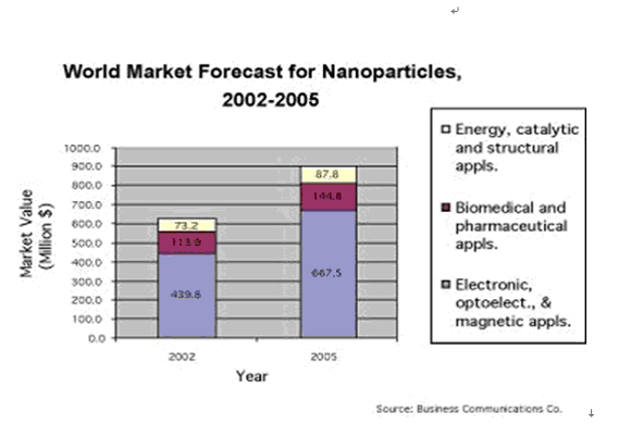納米科技是21世紀科技發展的重要技術領域,藉由納米科技將創造另一波技術創新及產業革命。近年來歐美日各國均投入大量人力與經費,進行納米材料與應用技術的開發。納米材料應用的范圍甚廣,包含化工、民生、消費性電子、光學、生物、制藥、能源等產業的應用。根據美國市調機構Business Communication之調查分析結果,納米材料在整體產業的應用上,于2005年市場需求值可達9億美元,如(圖一)。諾貝爾獎得主Dr. Smalley表示,未來五十年人類面臨十大問題中,以能源居首,能源需求量成長了3~4倍,而納米技術將可帶動納米能源的革命性發展與突破,包括納米鋰電池、太陽能電池、燃料電池、儲氫系統、光觸媒、光電池等等應用。