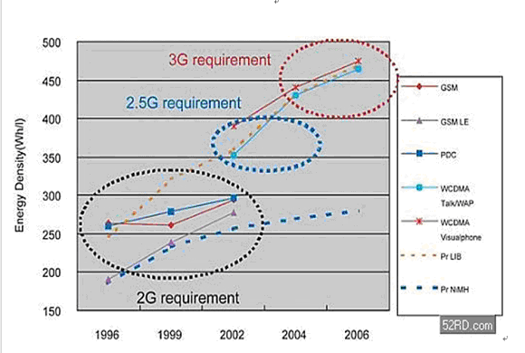 (圖二) 3G行動電話對電池能量密度的規格需求