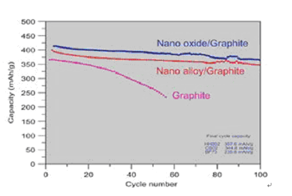 其中,經由高能量研磨的納米合金粉體(SnSb, LiSnM alloy, LiM alloy, M=Al, Fe, Si, In),雖然具有一些延性納米結構組織(ductile structure),可以防止合金材料在鋰離子的充放電測試中,所造成之合金膨脹與碎裂,提高了材料的壽命;然而不可逆容量太高及材料導電度低,仍需要進一步克服,才能夠應用于鋰電池負極材料。而利用納米表面改質技術,將納米氧化物或納米合金,在碳材表面所形成的納米復合負極材料,除了具有較高的電容量(>420mAh/g),約較傳統碳(320mAh/g)的電容量高出40%,如(圖四)。這種納米改質的納米復合負極負極材料,又擁有價格低的優勢,未來是具有市場競爭力,如(表一);將此技術應用于石墨負極材料,更可以大大提升石墨在PC-based電解液系統的壽命。這主要是因為靠石墨表面上的納米鍍層可以防止石墨層表面與電解液的反應,而抑制石墨層的膨脹與剝離,并使電池的容量與壽命延長。