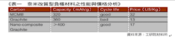(表一) 納米改質型負極材料之性能與價格分析