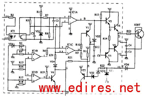 在M57962L輸入端13和14無電流時,IC1截止,A點電位上升使IC2A的2腳變為低電位,則使V3、V5導通,V2、V4截止。lGBT的門極(GATE)通過V5導通到VEE,而使IGBT關斷。IC2C的14腳輸出為低電平, 使V1、V7導通, 使IC2B、IC2D保持原先狀態不變。