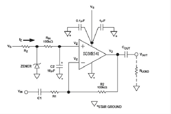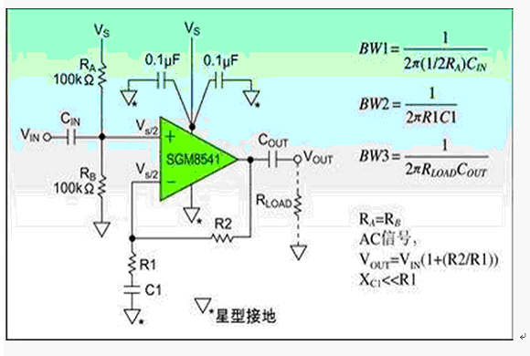 首先,電路的電源抑制幾乎沒有,電源電壓的任何變化都將直接通過兩個分壓電阻改變偏置電壓Vs/2,但電源抑制的能力是電路非常重要的特性。例如此電路的電源電壓1伏的變化,能引起偏置電路電壓的輸出Vs/2變化0.5伏。該電路的電源抑制僅僅只有6dB,通過選用SGM8541運算放大器可以增強電源抑制能力。