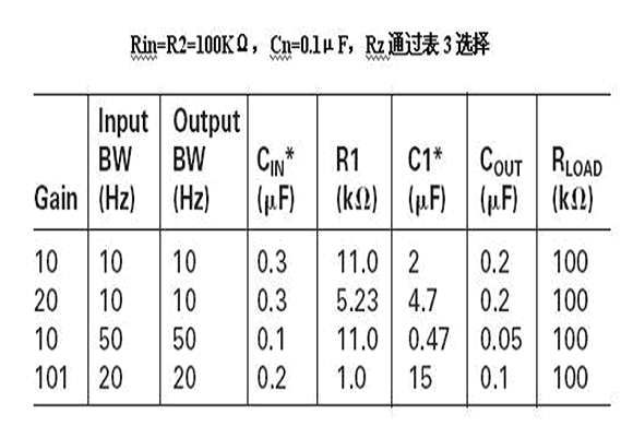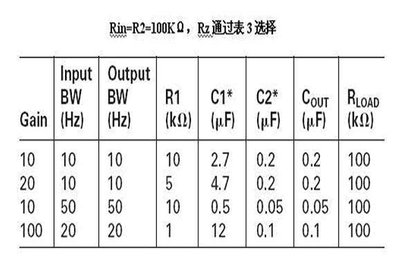 設計單電源運算放大器電路,需要考慮輸入偏置電流誤差、電源抑制、增益、以及輸入與輸出線路帶寬等等。然而普通的應用設計是可以通過查表來獲得,見表1。在單電源電壓為15V或12V時偏置分壓的兩個電阻通常選用100kΩ,這樣可以在電源消耗與輸入偏置電流誤差之間合理的折中。5V單電源偏置分壓電阻減小到一個比較低的值,例如42kΩ。還有些在3.3V應用中偏置分壓電阻選在27kΩ左右。