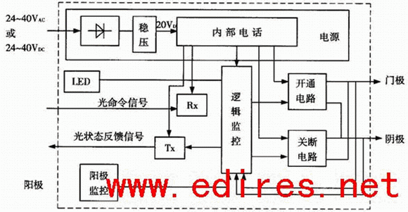 光控接口采用在工業(yè)生產中廣泛使用的標準元器件,它由Agilent技術生產的HFBR系列,推薦的標準型號光纖是1mm POF(塑料光纖) ,既經(jīng)濟又便于使用。對于超過15m的長距離推薦使用200μm的HCS光纖(硬包層石英光纖) 。光接收器:Agilent HFBR22528型,光輸入功率Poncs>- 21dBm(1 mm POF) , 光噪聲功率Poffcs <- 40dBm,光脈沖寬度門檻tGLITCH≤400ns ,對寬度≤400ns的光信號沒有響應。