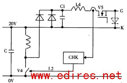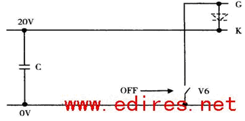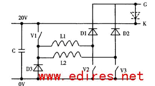 硬驅動關斷如圖4所示電路,當將V6 開通時,電容C 對門極反向放電,將IGCT關斷。由于電路的極低電感(5 到15nH 取決于IGCT 的型號)和大電容器組,IGCT對門2陰極端的電磁噪音不敏感。與IGCT相比較,傳統(tǒng)的GTO驅動裝置大約有200 nH的電感和更小的電容器組。