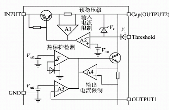 從圖1中還可以看出,VB409還有輸入、輸出電流的限制和熱保護功能。其作用在于:一方面當輸出短路時限制電流的輸出;另一方面當過載時關(guān)斷芯片。