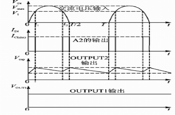VB409采取的是導(dǎo)通角技術(shù),即在交流電的一個周期中,根據(jù)負載的電流大小,自動調(diào)整每個周期的導(dǎo)通時間。也就是說,只在每個正周期的低壓部分,從電源吸收電能,因此極大地降低了功耗,電流輸出能力是線性電源的3倍。其工作波形如圖2所示。
