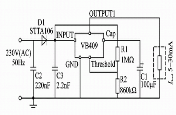 在小型的MCU應(yīng)用系統(tǒng)中,采用AC 220V供電時,一般要使用變壓器對電源進行處理,將高壓交流電降到低壓后再進行直流處理,或者將交流電變?yōu)楦邏褐绷麟姾笤龠M行高頻變換,以得到MCU系統(tǒng)的工作電源。這對于結(jié)構(gòu)沒有特殊要求的系統(tǒng),在設(shè)計上屬于常規(guī)的問題,使用上述的線性電源技術(shù)或者開關(guān)電源技術(shù),均能得到方便的解決。但是有些MCU應(yīng)用系統(tǒng)在體積上要求極其小巧,甚至不能安放變壓器,所以常規(guī)的電源處理就不能滿足其要求了。因此,使用能夠直接接收高壓交流電并將其直接變換成低壓直流的技術(shù),是最佳的設(shè)計選擇。VB409的出現(xiàn)有望實現(xiàn)這一設(shè)計思路。