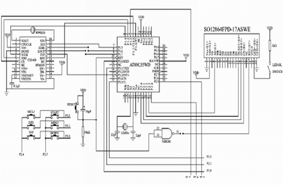 圖4為筆者設(shè)計的一個典型應(yīng)用系統(tǒng)的原理圖。圖4為測量電能并在LCD上顯示的MCU應(yīng)用系統(tǒng)。CPU采用AT89C55WD,最大耗電量為20 mA(若采用STC89C58RD+,則耗電量可降至9 mA左右);LCD選用SO12864,采用COG式,連同背光最大耗電為20mA;功率/電能計量芯片CS5460的最大耗電量為5 mA,加上復(fù)位、鍵盤等最大耗電量小于50 mA;繼電器輸出沒有畫出,耗電量為12mA。因此,完全可以使用VB409供電,且系統(tǒng)體積小,完全可以放置在LCD背后。