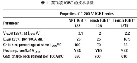 英飛凌的3 個主要IGBT 技術系列的最重要的專用參數如表1 所列,它們都為1 200 V SEMI原TRANS模塊所使用。