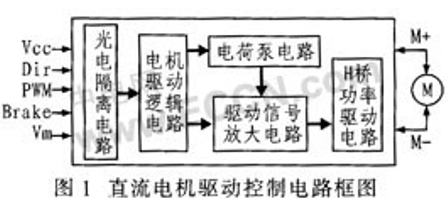 直流電機(jī)驅(qū)動(dòng)控制電路分為光電隔離電路、電機(jī)驅(qū)動(dòng)邏輯電路、驅(qū)動(dòng)信號(hào)放大電路、電荷泵電路、H橋功率驅(qū)動(dòng)電路等四部分,其電路框圖如圖1所示。