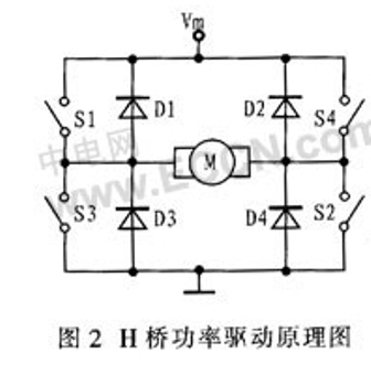 直流電機(jī)驅(qū)動(dòng)使用最廣泛的就是H型全橋式電路,這種驅(qū)動(dòng)電路方便地實(shí)現(xiàn)直流電機(jī)的四象限運(yùn)行,分別對(duì)應(yīng)正轉(zhuǎn)、正轉(zhuǎn)制動(dòng)、反轉(zhuǎn)、反轉(zhuǎn)制動(dòng)。H橋功率驅(qū)動(dòng)原理圖如圖2所示。