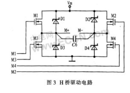相對(duì)來(lái)說(shuō),利用2個(gè)N溝道功率MOSFET和2個(gè)P溝道功率MOSFET驅(qū)動(dòng)電機(jī)的方案,控制電路簡(jiǎn)單、成本低。但由于加工工藝的原因,P溝道功率MOSFET的性能要比N溝道功率MOSFET的差,且驅(qū)動(dòng)電流小,多用于功率較小的驅(qū)動(dòng)電路中。而N溝道功率MOSFET,一方面載流子的遷移率較高、頻率響應(yīng)較好、跨導(dǎo)較大;另一方面能增大導(dǎo)通電流、減小導(dǎo)通電阻、降低成本,減小面積。綜合考慮系統(tǒng)功率、可靠性要求,以及N溝道功率MOSFET的優(yōu)點(diǎn),本設(shè)計(jì)采用4個(gè)相同的N溝道功率MOSFET的H橋電路,具備較好的性能和較高的可靠性,并具有較大的驅(qū)動(dòng)電流。其電路圖如圖3所示。圖中Vm為電機(jī)電源電壓,4個(gè)二極管為續(xù)流二極管,輸出端并聯(lián)一只小電容C6,用于降低感性元件電機(jī)產(chǎn)生的尖峰電壓。