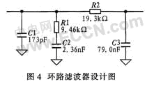 三階環路濾波電路如圖4所示,PFD的相位檢測頻率fr=200 kHz,相位裕量φp=45°,由于外接晶體振蕩頻率源為20 MHz,所以計算出參考分頻比N=100,利用ADI公司提供的ADIsimPLL工具計算三階環路濾波器參數:R1=9.46 kΩ,C1=173 pF,C2=2.36 nF,R2=19.3 kΩ,C3=79 pF。