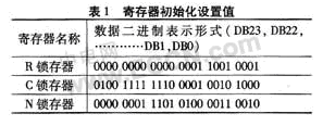 主分頻比N=1.5 GHz/200 kHz=7 500 。需要注意的是:雙模前置分頻器(P/P+1)輸出頻率要求小于300 MHz。因此選擇P/P+1=16/17,根據N=BF+A(A、B為整數),得到A=12,B=468。3個24位鎖存器的初始化設置如表1所示。