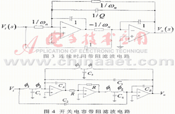 給定雙二階連續時間帶阻濾波器的電路圖如圖3,用開關電容來替代電阻后得到開關電容帶阻濾波電路(圖4),利用式(2)推導出圖4電路的離散時間傳遞函數為:
