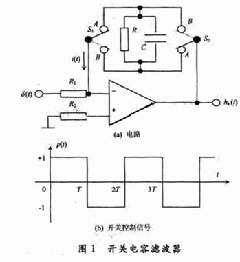 開關電容有源濾波器電路如圖1(a),其中S1和S2是由周期為2T的方波信號控制的理想電子開關,方波控制信號p(t)波形如圖1(b),其占空系數(shù)為0.5。即在2kT<t<(2K+1)T期間兩開關接通A點,在(2K+1)T<t<(2K+2)T期間兩開關接通B點,其中K=0,1,2,…,是時段編號。