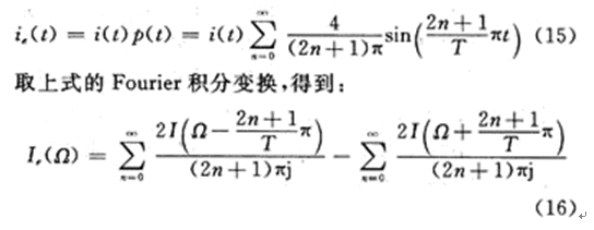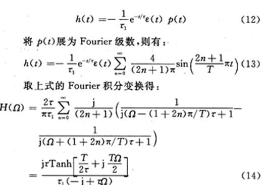 特別注意,求和式是一周期為2T的周期方波p(t)與單位階躍信號ε(t)的乘積,對上式取Fourier積分變換即得到開關電容電路系統(tǒng)頻譜函數(shù)(用j表示虛數(shù)單位,下同):