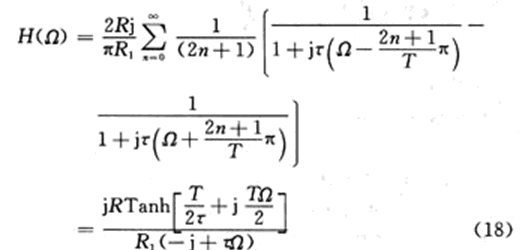 上式說明,Ie(Ω)是輸入電流頻譜I(Ω)周期延拓的組合,周期為Ω0=2π/T。各電流分量流過RC并聯(lián)支路時的電壓為相應電流分量與RC支路阻抗(R/(1+jωτ),ω=Ω±(2n+1)π/T)的乘積,于是輸出電壓頻譜U(Ω)為: