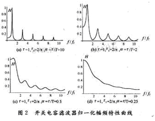 (4)隨著電子開關切換周期2T增大(α減小),梳齒間谷底最小值逐漸增大。電路逐漸過渡為幅頻特性曲線輕微起伏的低通濾波器,如圖2(d)所示。低通濾波器傳輸函數(shù)極大值為: