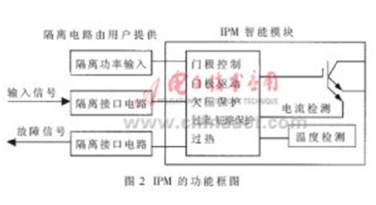 IPM的功能框圖如圖2所示。IPM內(nèi)置驅(qū)動和保護(hù)電路,隔離接口電路需用戶自己設(shè)計(jì)。