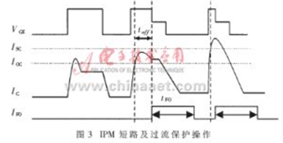 (3)過流保護(hù)(OC):若流過IGBT的電流值超過過流動作電流,且時(shí)間超過toff,則發(fā)生過流保護(hù),封鎖門極驅(qū)動電路,輸出故障信號。為避免發(fā)生過大的,大多數(shù)IPM采用兩級關(guān)斷模式,過流保護(hù)和短路保護(hù)操作可參見圖3。其中,VG為內(nèi)部門極驅(qū)動電壓,ISC為短路電流值,IOC為過流電流值,IC為集電極電流,IFO為故障輸出電流。