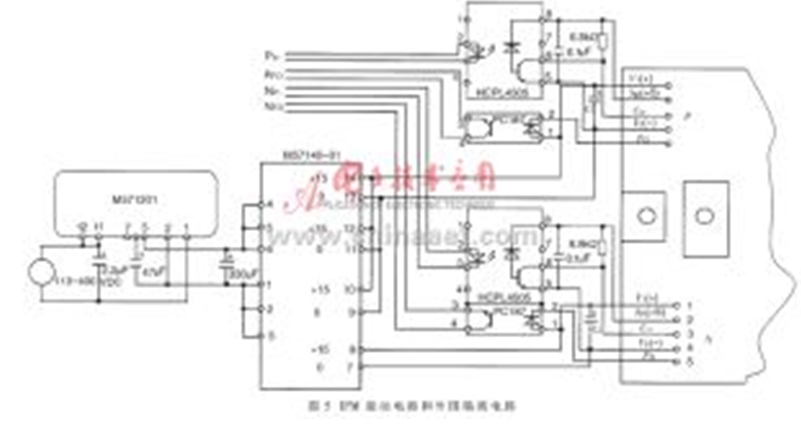 筆者在DSP控制開關(guān)磁阻電機(jī)的項(xiàng)目中,選用IPM作為功率變換器的主開關(guān)器件,控制器采用了德州公司的TMS320F240 數(shù)字信號處理器,功率驅(qū)動電路的輸入(即IPM的控制信號)由TMS320F240內(nèi)含的全比較單元相對應(yīng)的PWM1~PWM4產(chǎn)生。