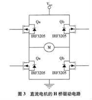 直流電動機是EPS系統的執行元件,電機的控制電路在系統設計中有著特殊的地位。在本系統中采用脈寬調制(PWM)控制H橋電路實施對直流電動機的控制,由4個功率MOSFET組成,如圖3所示。采用PWM伺服控制方式,MOSFET功率管的驅動電路簡單,工作頻率高,可工作在上百千赫的開關狀態下。系統采用4個International Reetifier公司生產的IRF3205型MOSFET功率管組成H橋路的4個臂。IRF3205具有8 mΩ導通電阻、功耗小、耐壓達55V、最大直流電流110A、滿足EPS系統對MOSFET功率管低壓(正常工作不超過15V)大電流(額定電流30 A)的要求。
