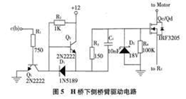 當MOSFET的控制信號c(d)低電平時, Q1截止,Q2導通,電源通過Q2以及R3與C,組成的并聯電路對Qc的柵極充電,直至Qc完全導通。當Qc導通時,其柵—源極電壓等于電源電壓減去Q2的集—射極飽和導通電壓,而電源電壓又等于蓄電池電壓減去1N5819二極管的正向導通電壓。所以,Qc的柵—源極電壓VGS=(Vbat-VCE-VF),當蓄電池電壓為12V,取各參數為典型值得Qc的柵-源極電壓為11.26V,滿足IRF3205的柵極驅動(10V)所需的電壓。