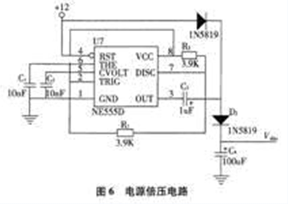 電源倍壓電路如圖6所示,NE555定時器工作于多諧振蕩器模式,于引腳3產生幅值等于NE555的供電電壓,頻率為1/0.7(R2+2R1)C1的矩形波。C3、C4,Dl和D2構成電荷泵電路。當NE555引腳3輸出高電平時,由于電容電壓不能突變,C3正極電壓為24V或接近24V,并通過D2向C4充電,使C4電壓為24V或接近24V。由于受電路的工作效率、二極管D1和D2上的正向電壓降以及負載能力的限制,使得系統輸出電壓低于供電電壓的2倍,即供電電壓為12V時,輸出電壓低于24V,當供電電源為12V時,倍壓電源電壓約為22.9V,大于Vdb1(22.74V),可以滿足需要。