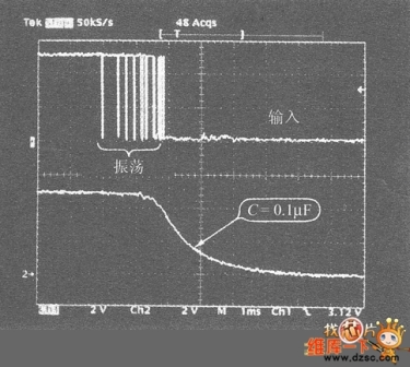 圖1是稱為限位開關(guān)的微型開關(guān)的振蕩波形圖。機械觸點的開關(guān)由于按壓方法、時間不同會發(fā)生各種各樣的振蕩,此時的時間、波形也各種各樣,這里表示了最長時間的振蕩的例子。