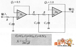 圖4的構(gòu)成與1次和2次電路級(jí)聯(lián)的方法相比較,電路簡(jiǎn)單化。而且也能用同一常數(shù)構(gòu)成。另外,OP放大器A,上具有增益,通過A1,的正反饋(省略A2),使OP放大器的個(gè)數(shù)減少了1個(gè)。注意這里需要通頻帶的增益為1.82倍。